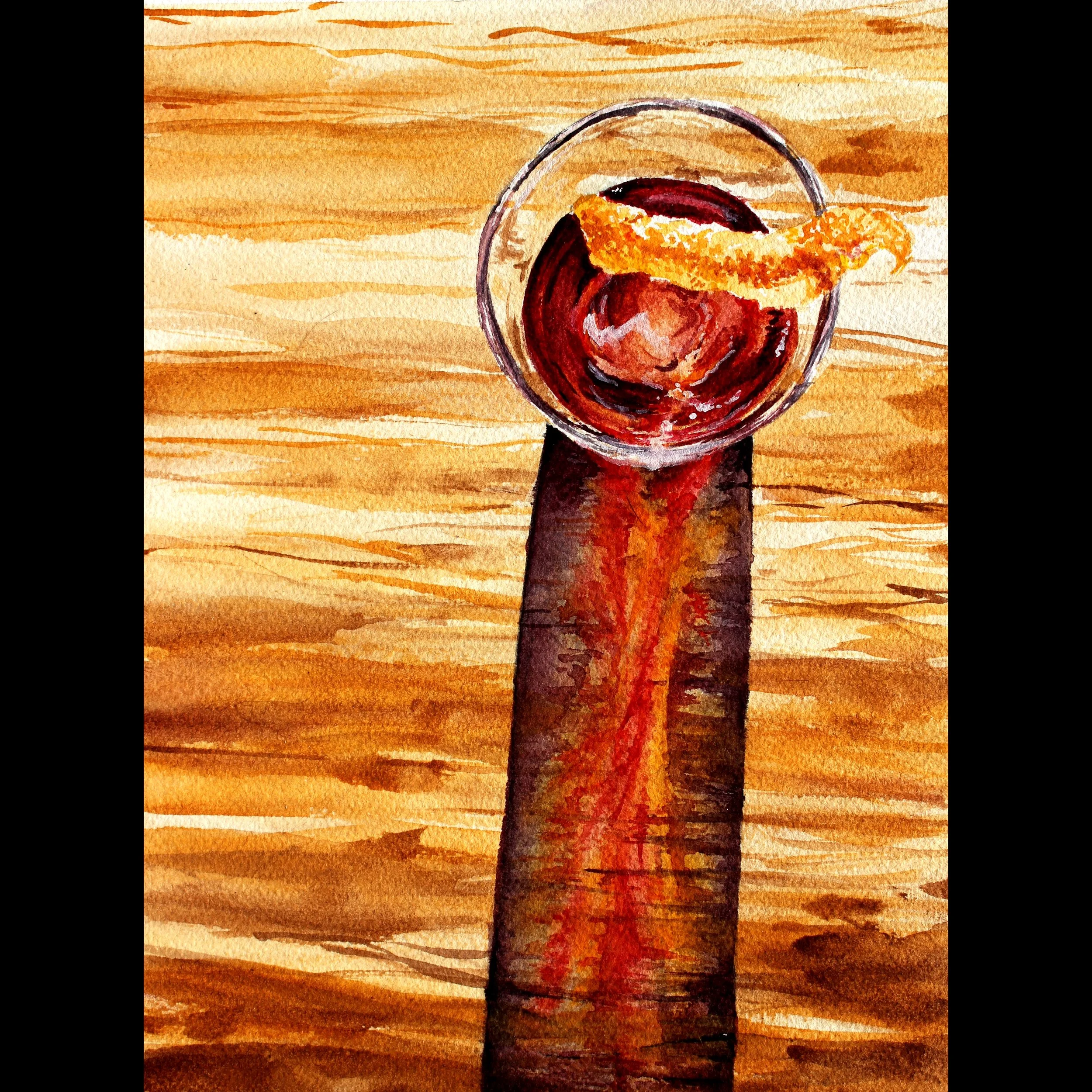 Who doesn’t love a great, classic Daiquiri? This watercolor still life is almost entirely painted with just three colors - teal, magenta, and gold - that blend together to make exciting and complicated grays, purples, and greens. Featuring a daiquiri in a coup glass garnished with a beautiful orchid, this painting also captures the complicated pattern of a decorative tray reflected in a cocktail shaker, with a spray of stylized peacock feathers in the background.